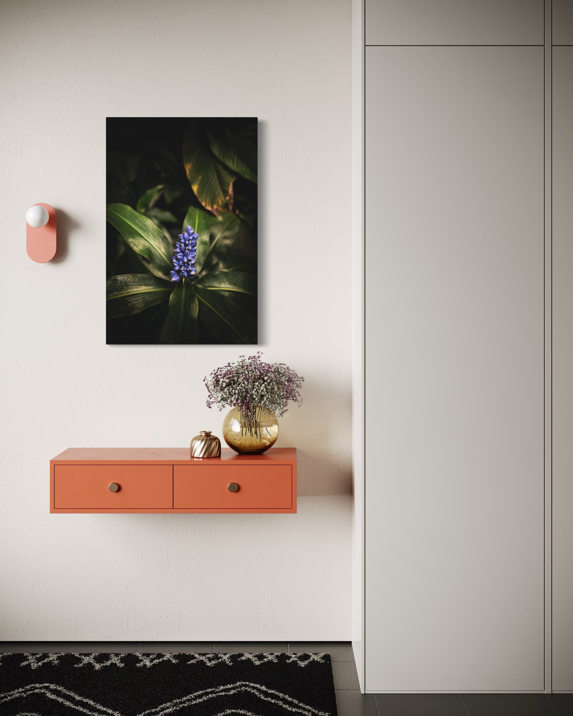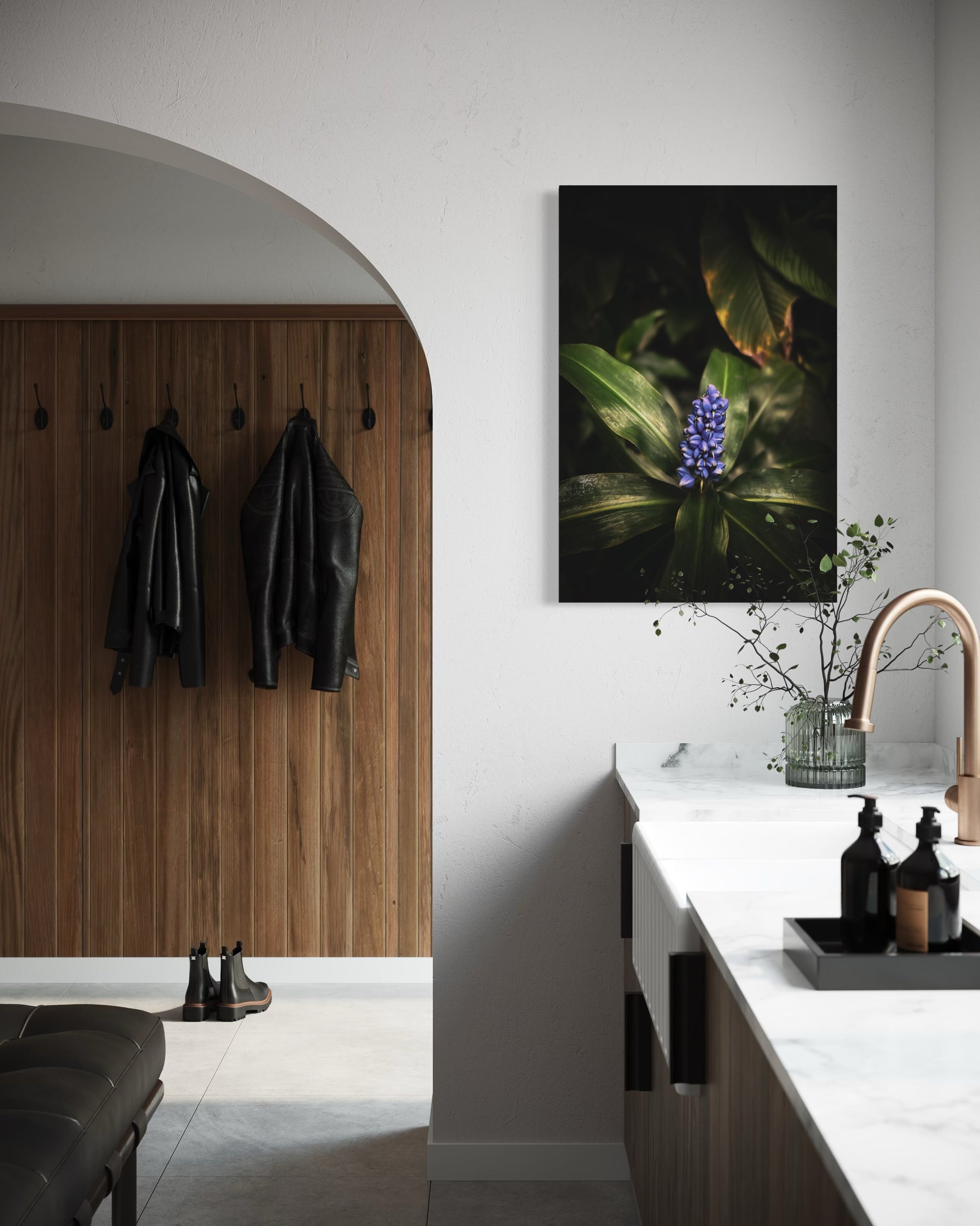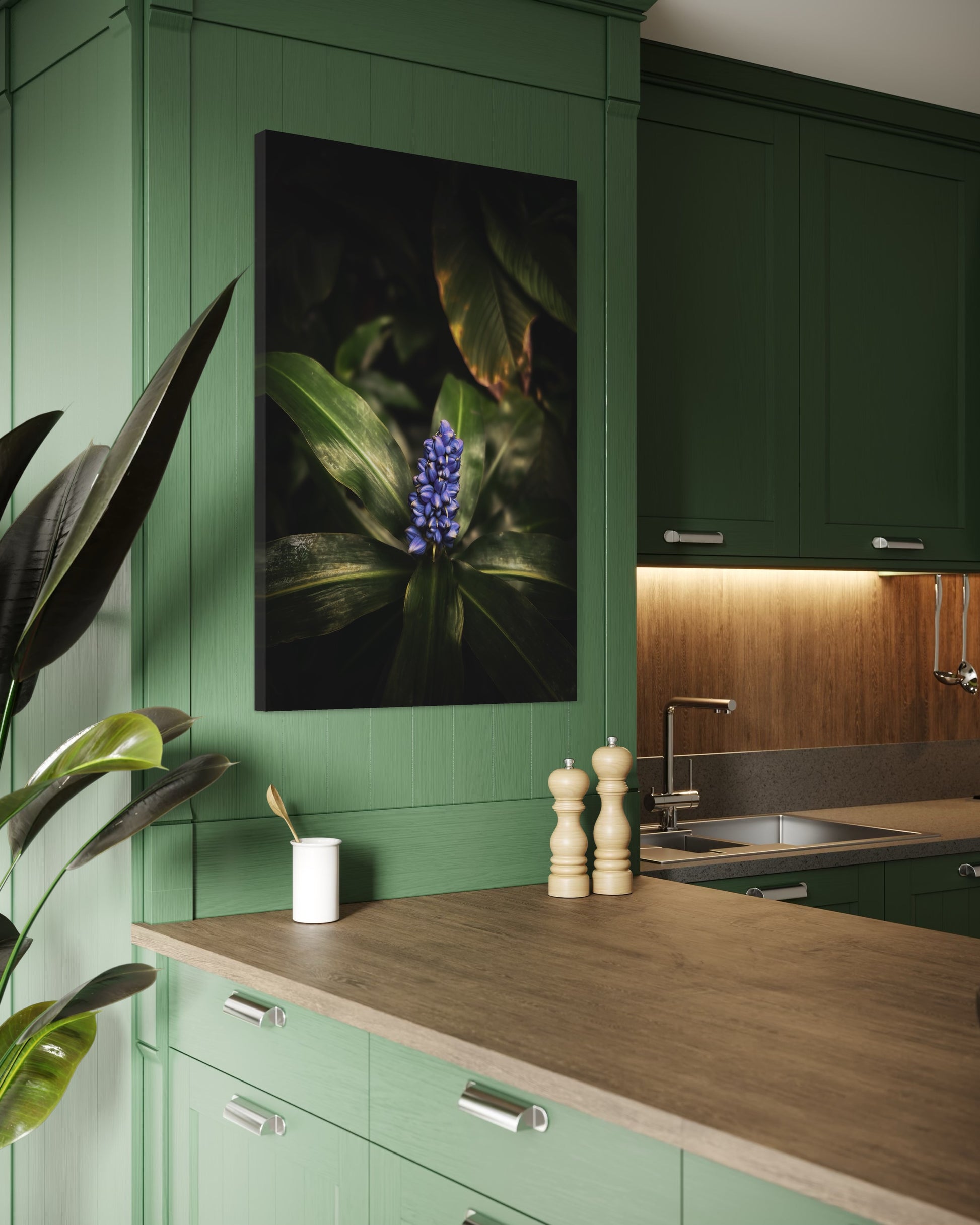 The vibrant blue flower emerging from deep green leaves embodies balance — between light and shadow, simplicity and mystery.Perfect for interiors seeking sophistication and calm.