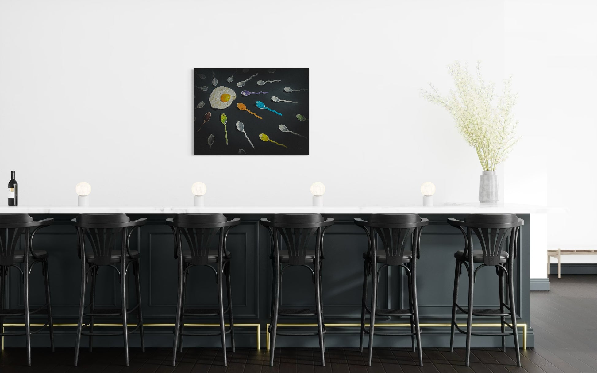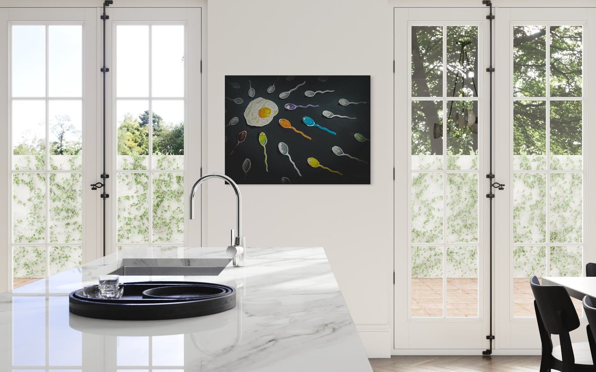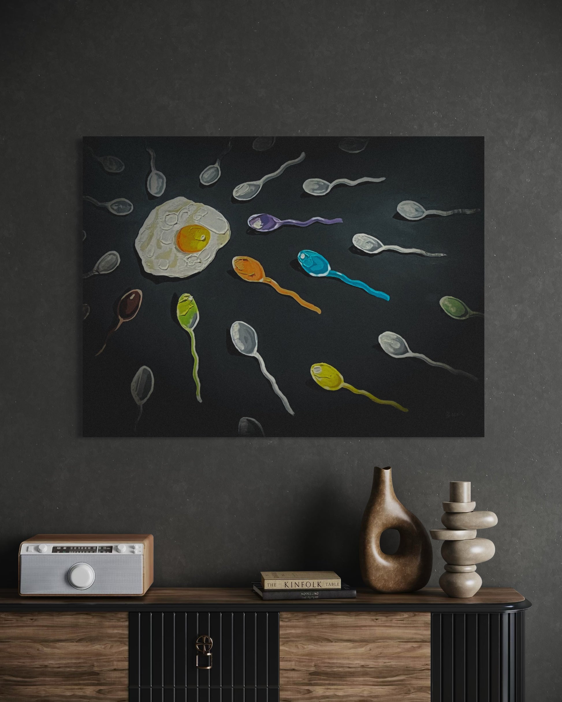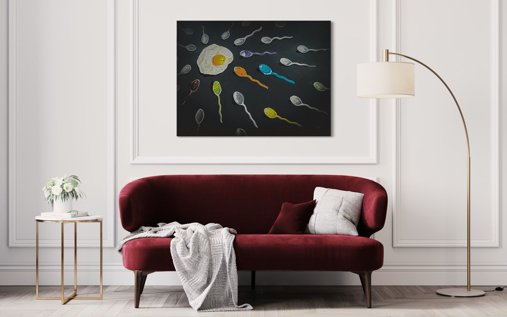 Colorful spoons rush toward a fried egg in a fun, dynamic composition —making this artwork a perfect conversation starter and a unique gift for food lovers