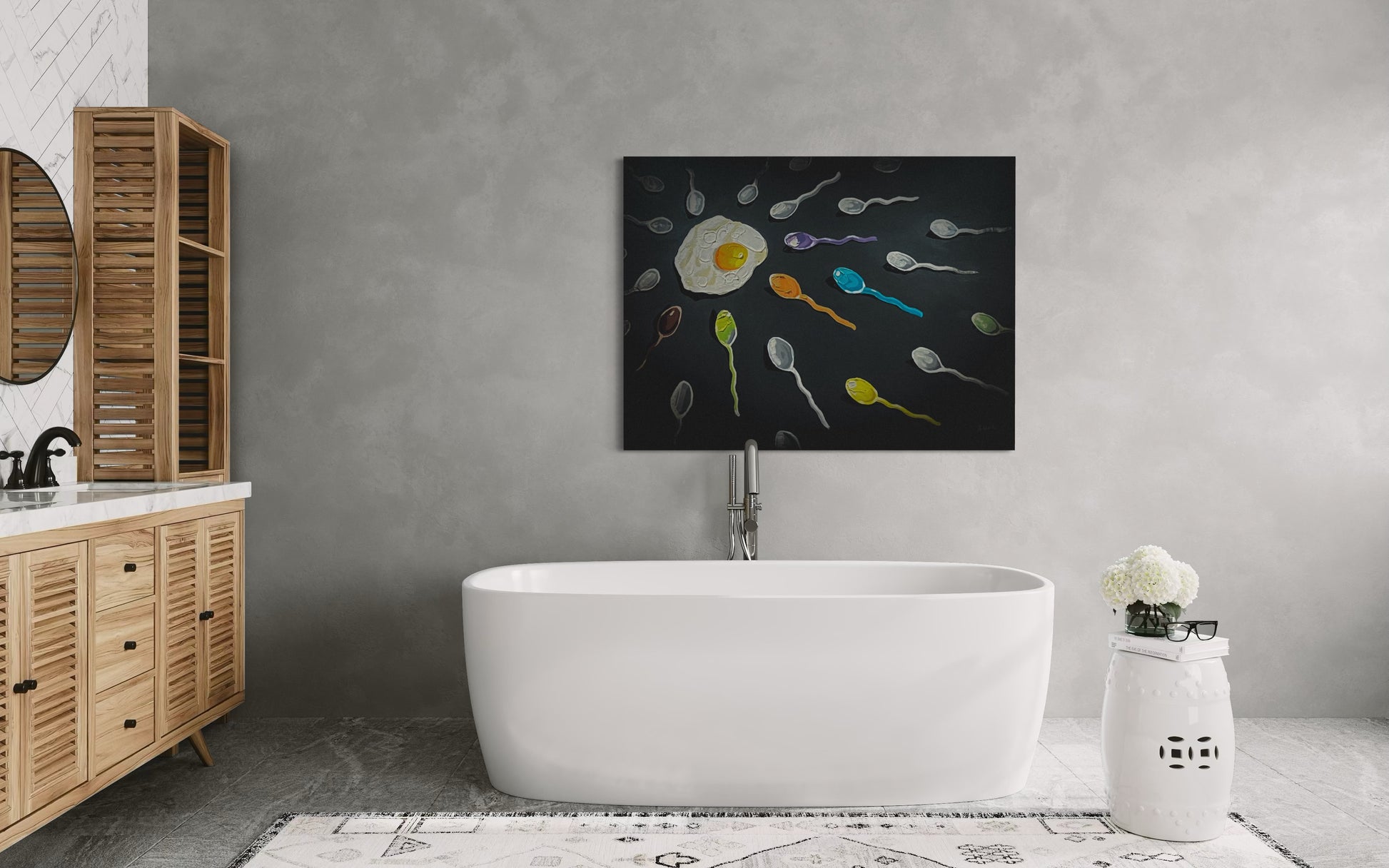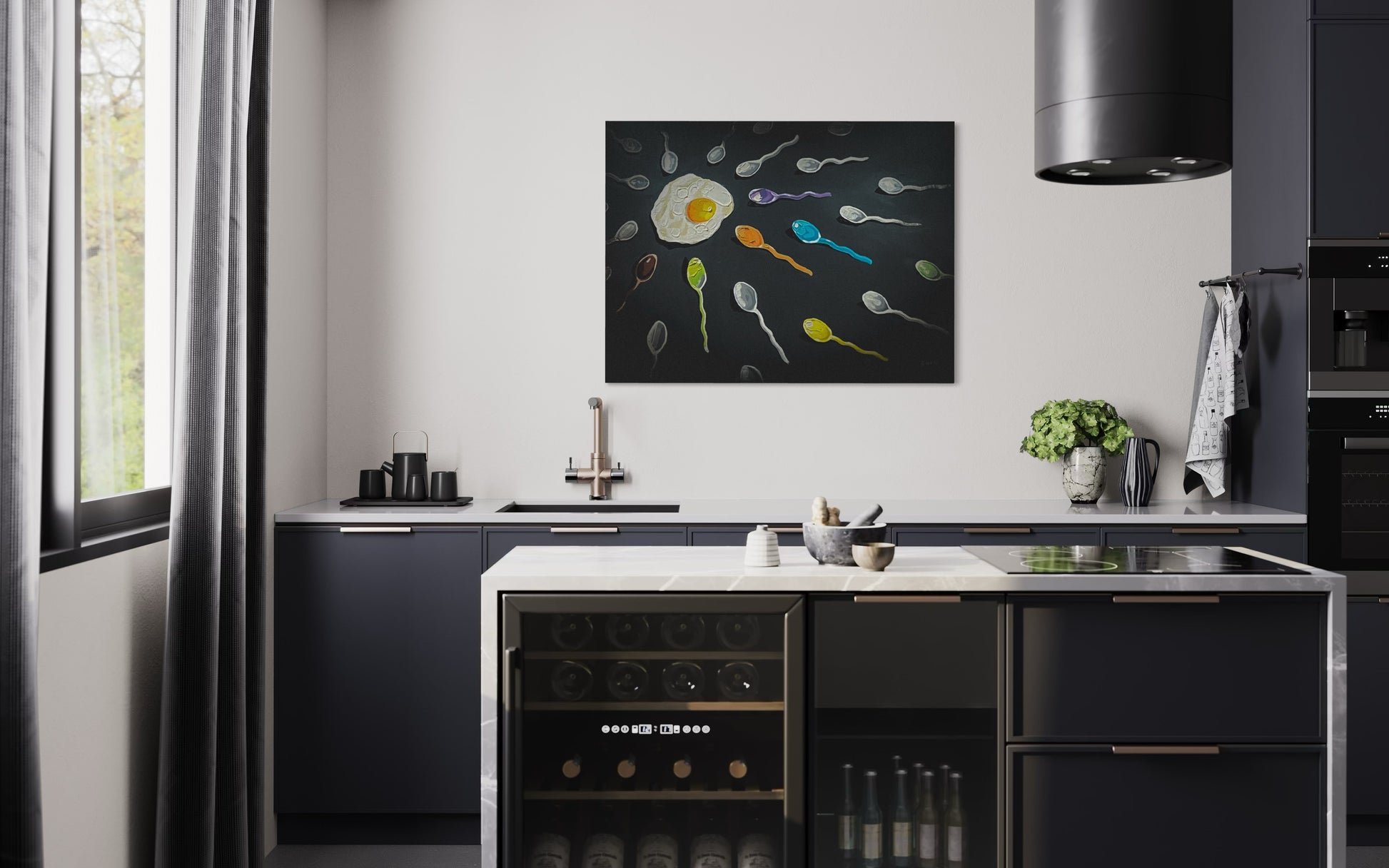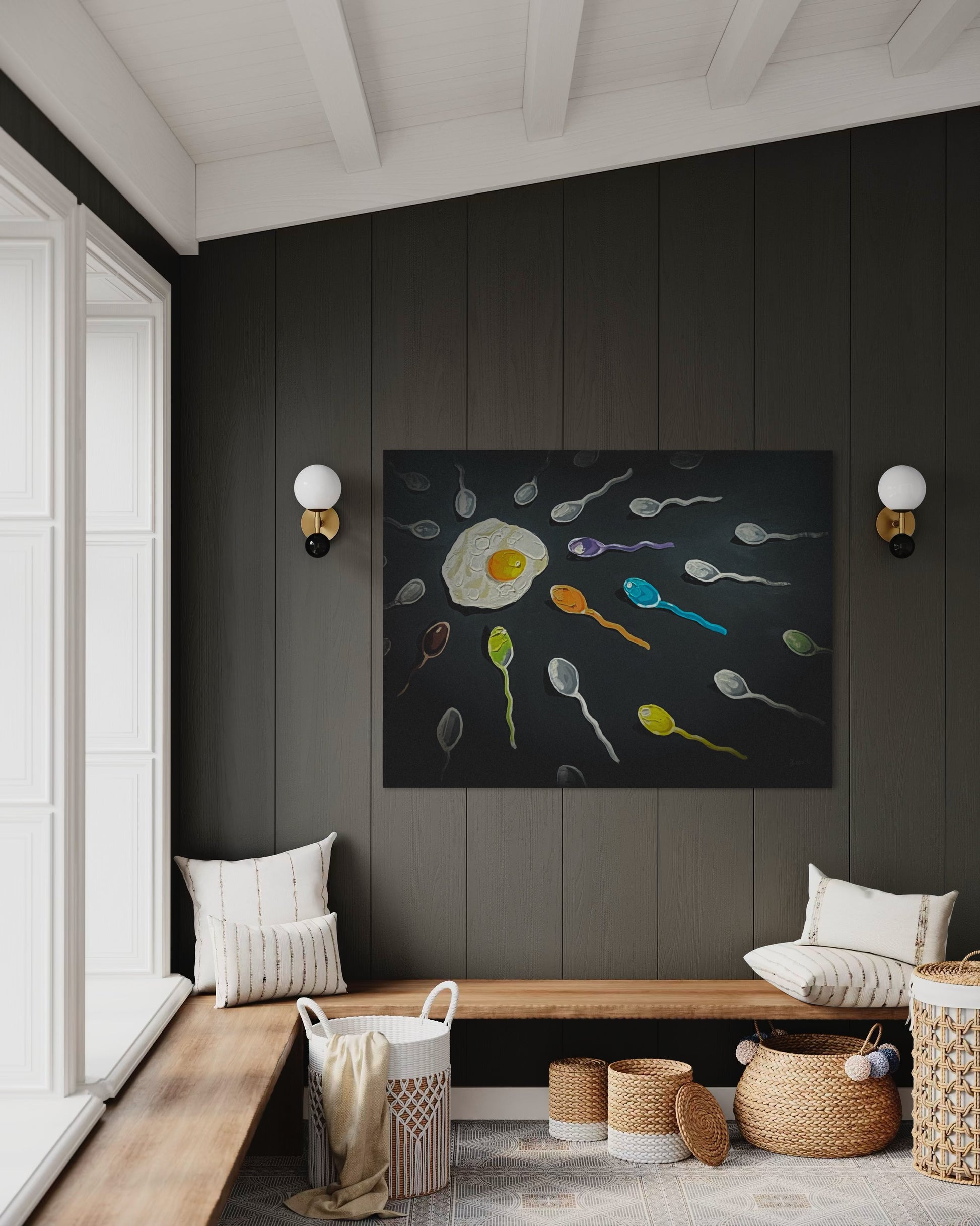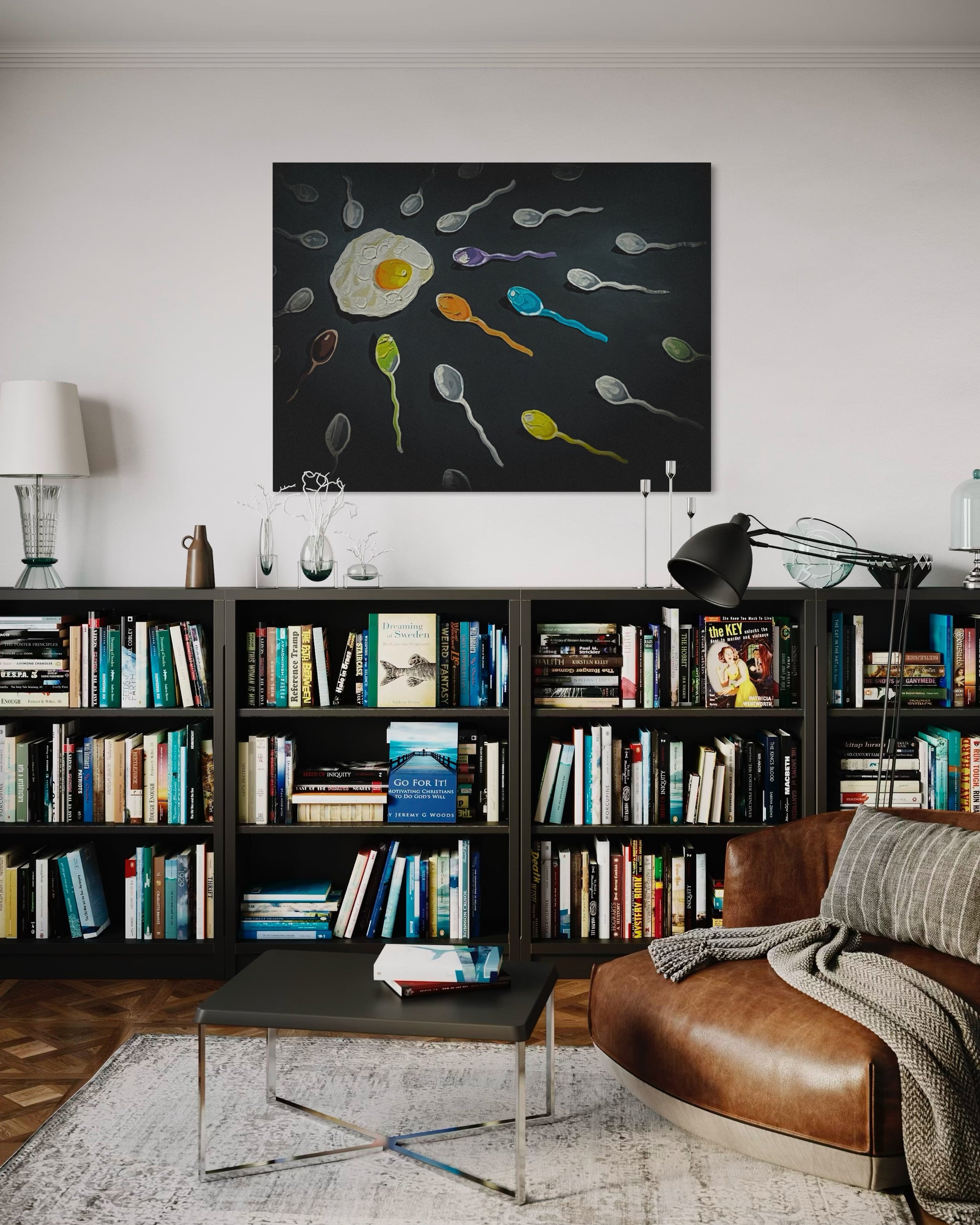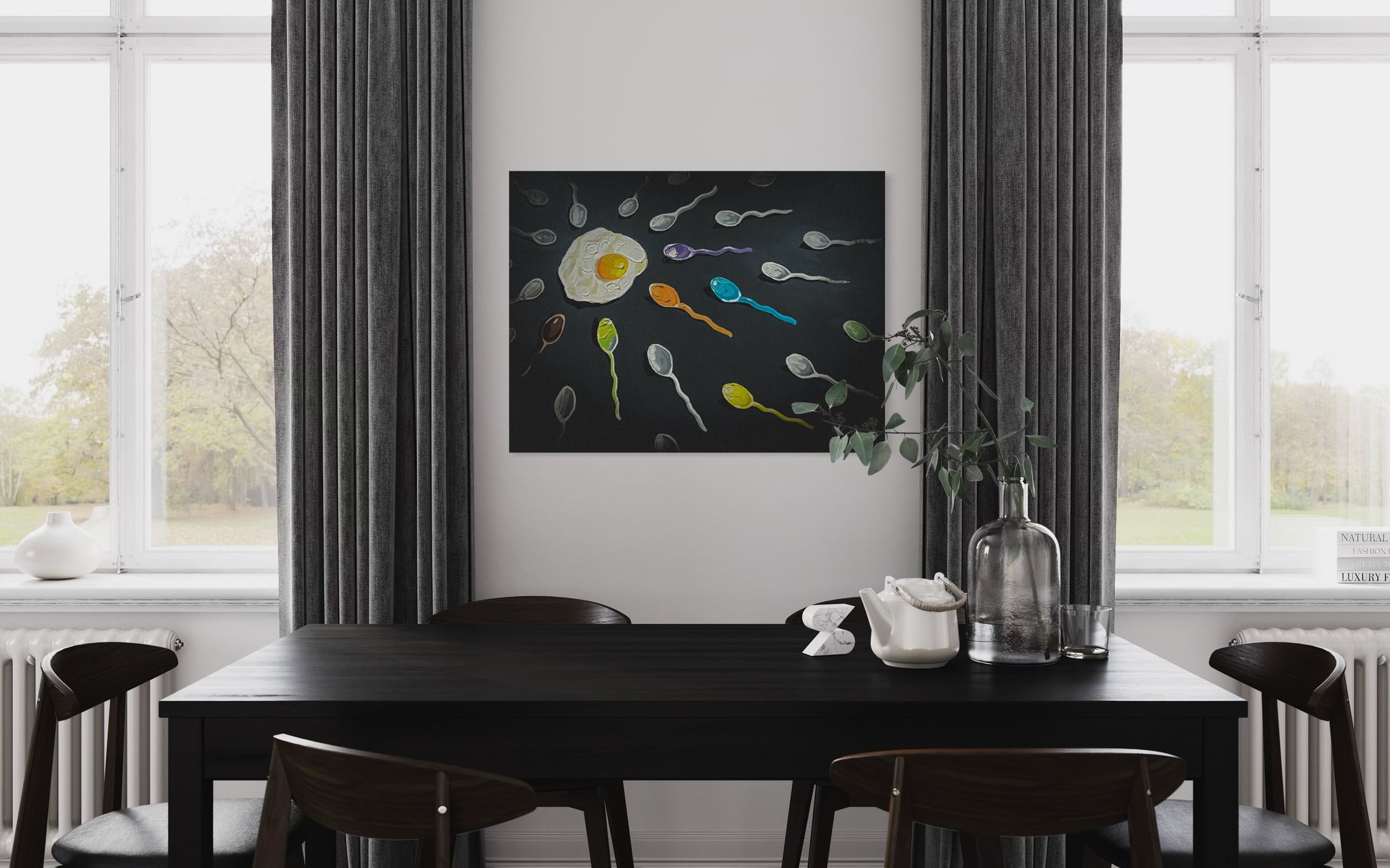 Colorful spoons rush toward a fried egg in a fun, dynamic composition —making this artwork a perfect conversation starter and a unique gift for food lovers