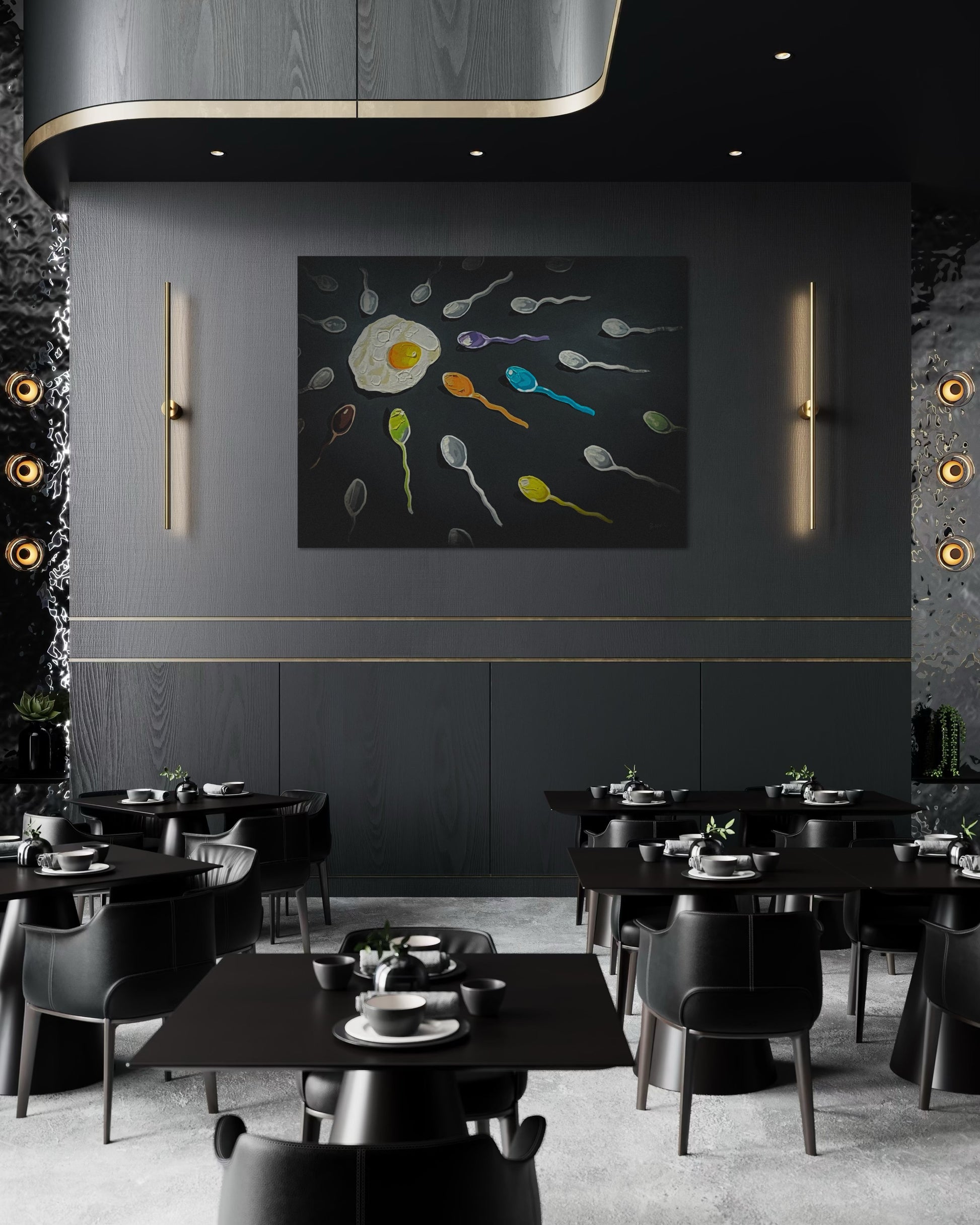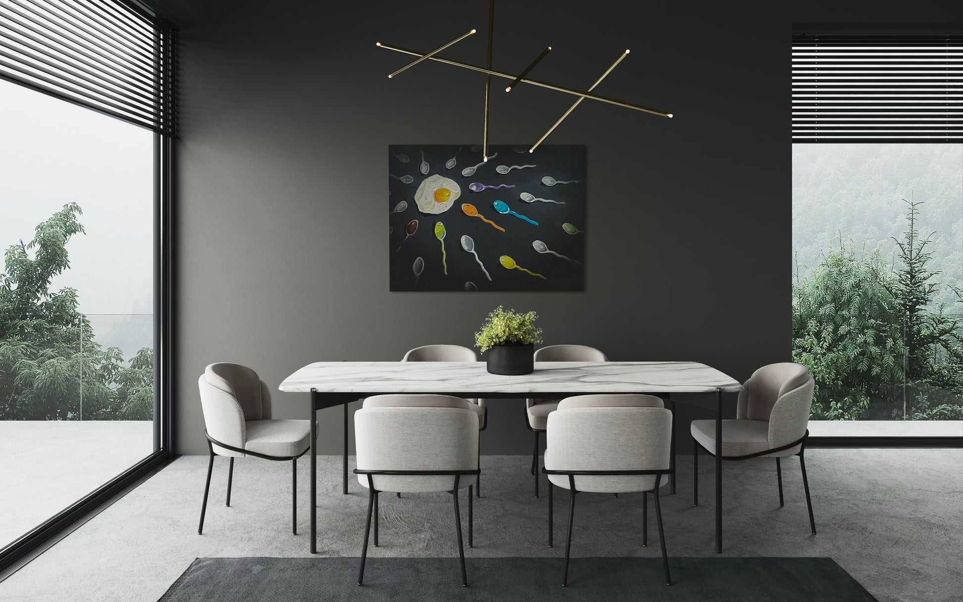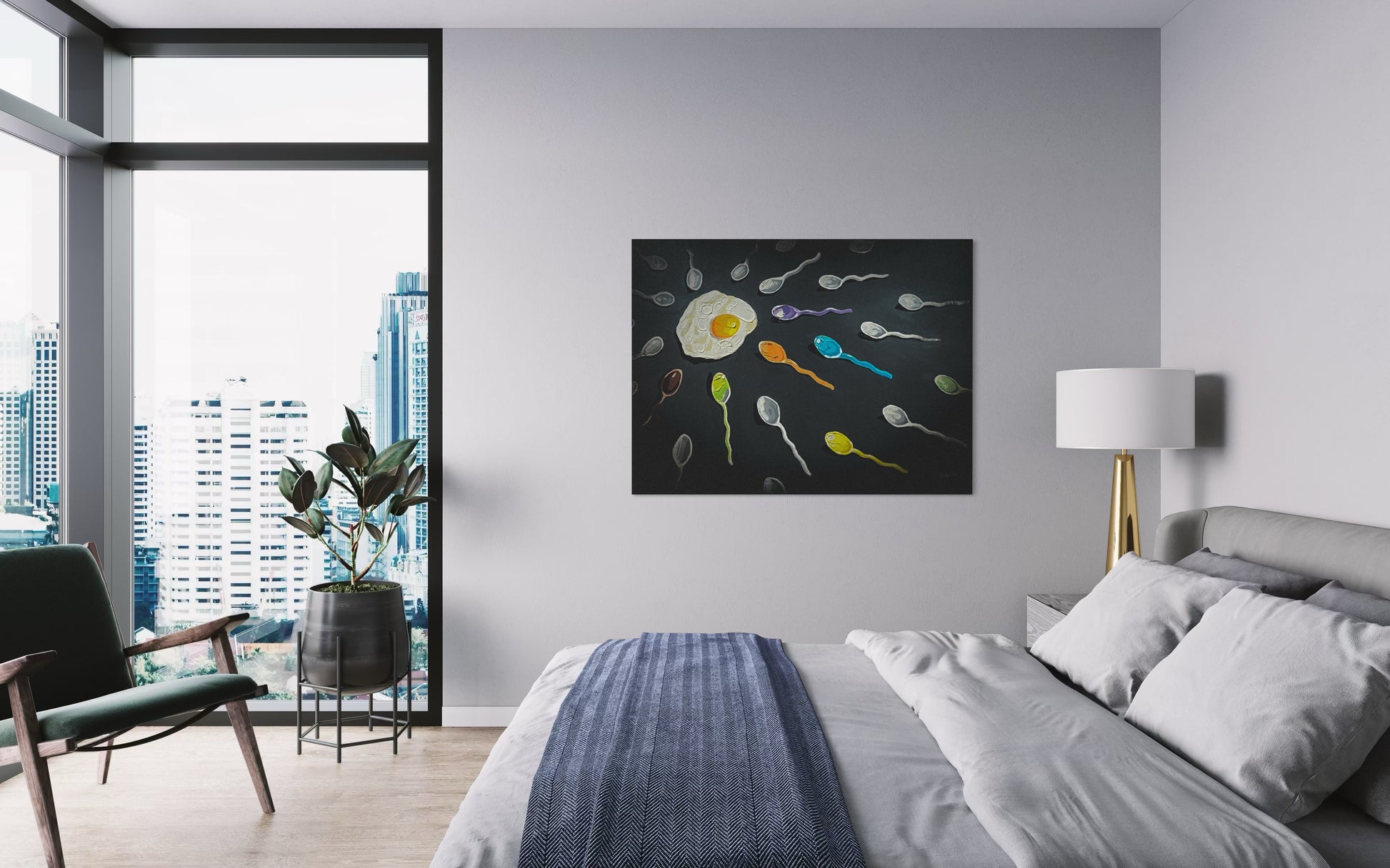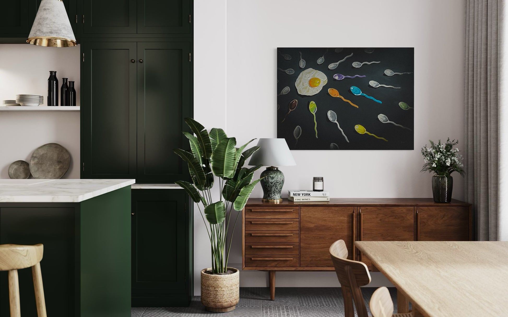 Colorful spoons rush toward a fried egg in a fun, dynamic composition —making this artwork a perfect conversation starter and a unique gift for food lovers