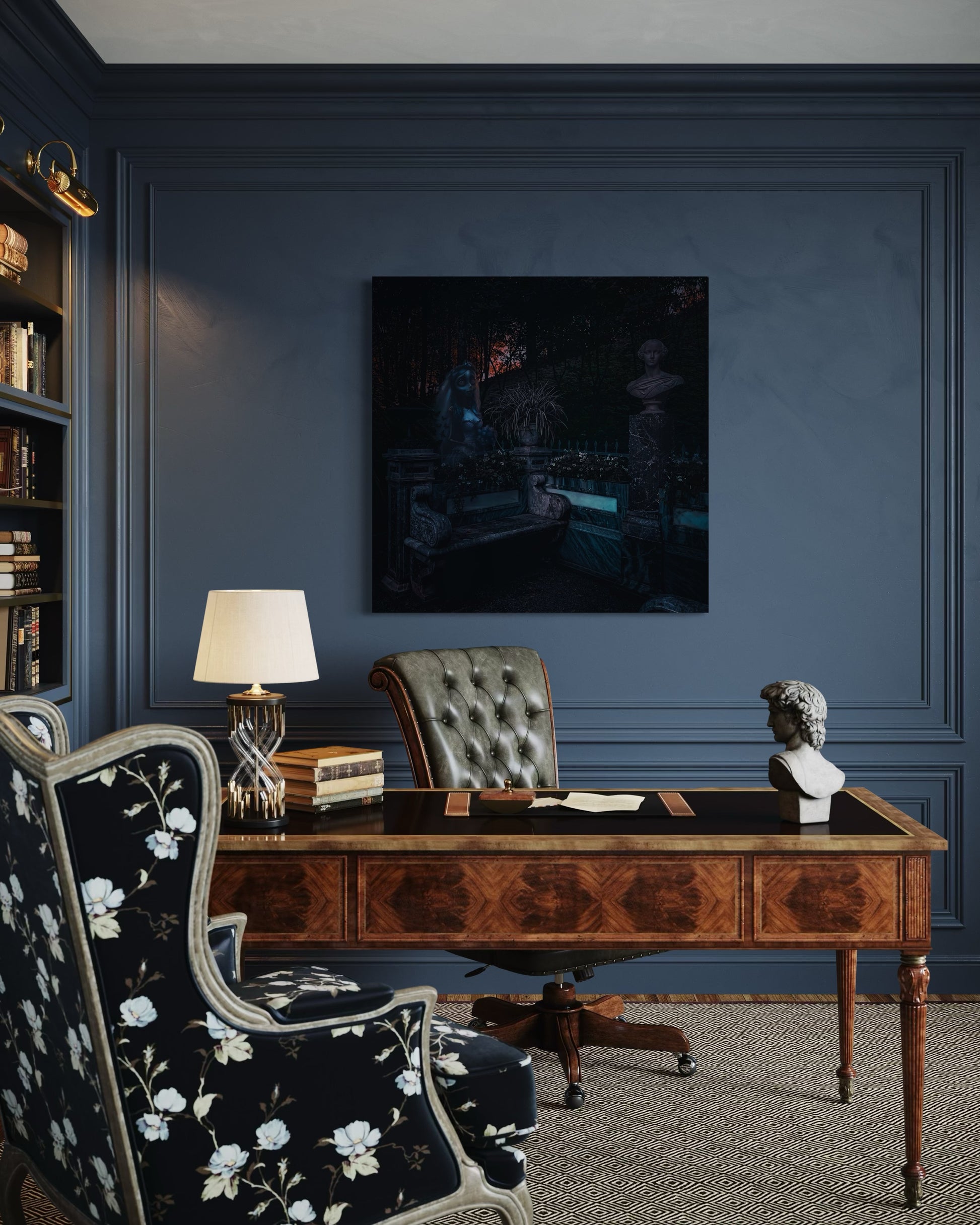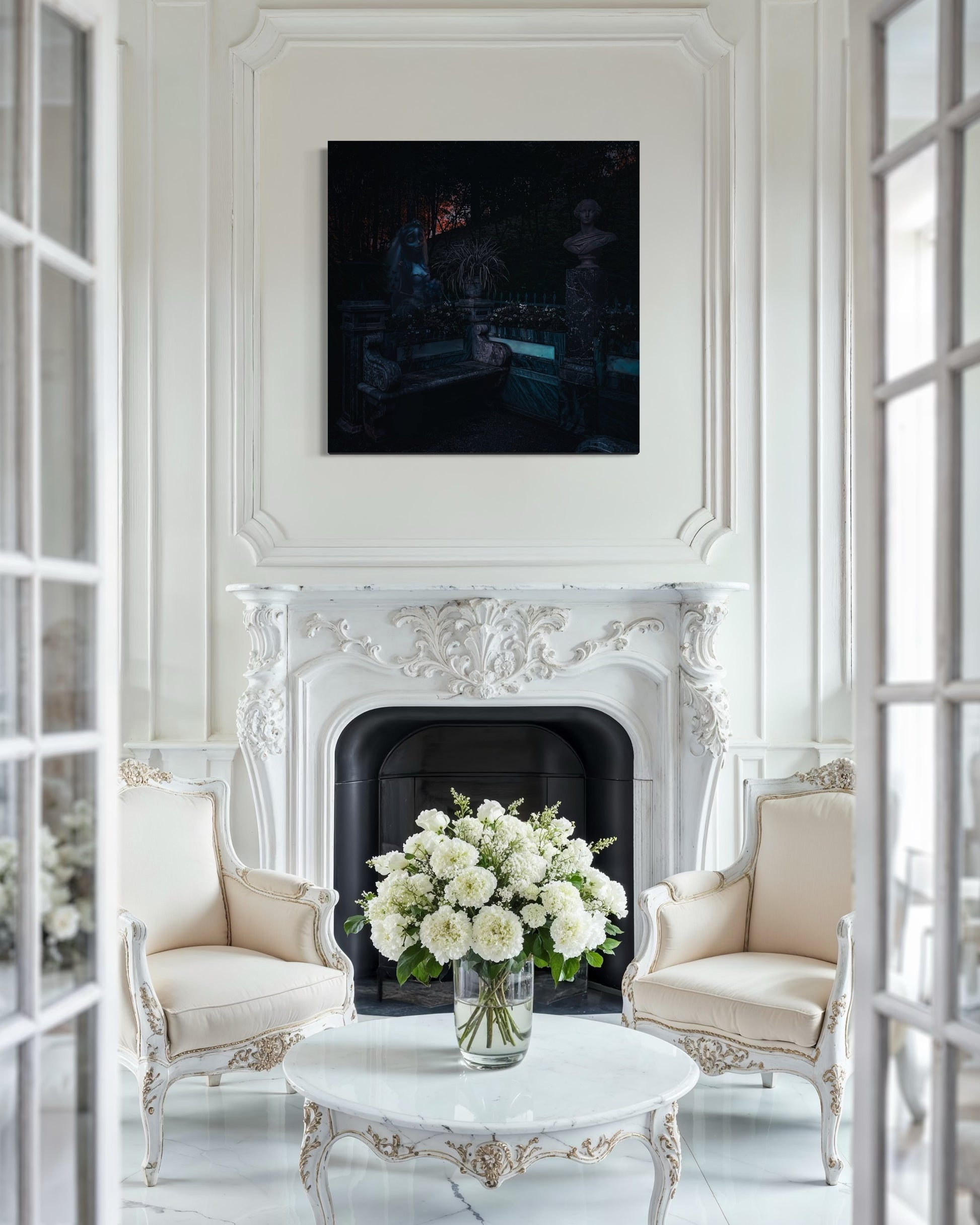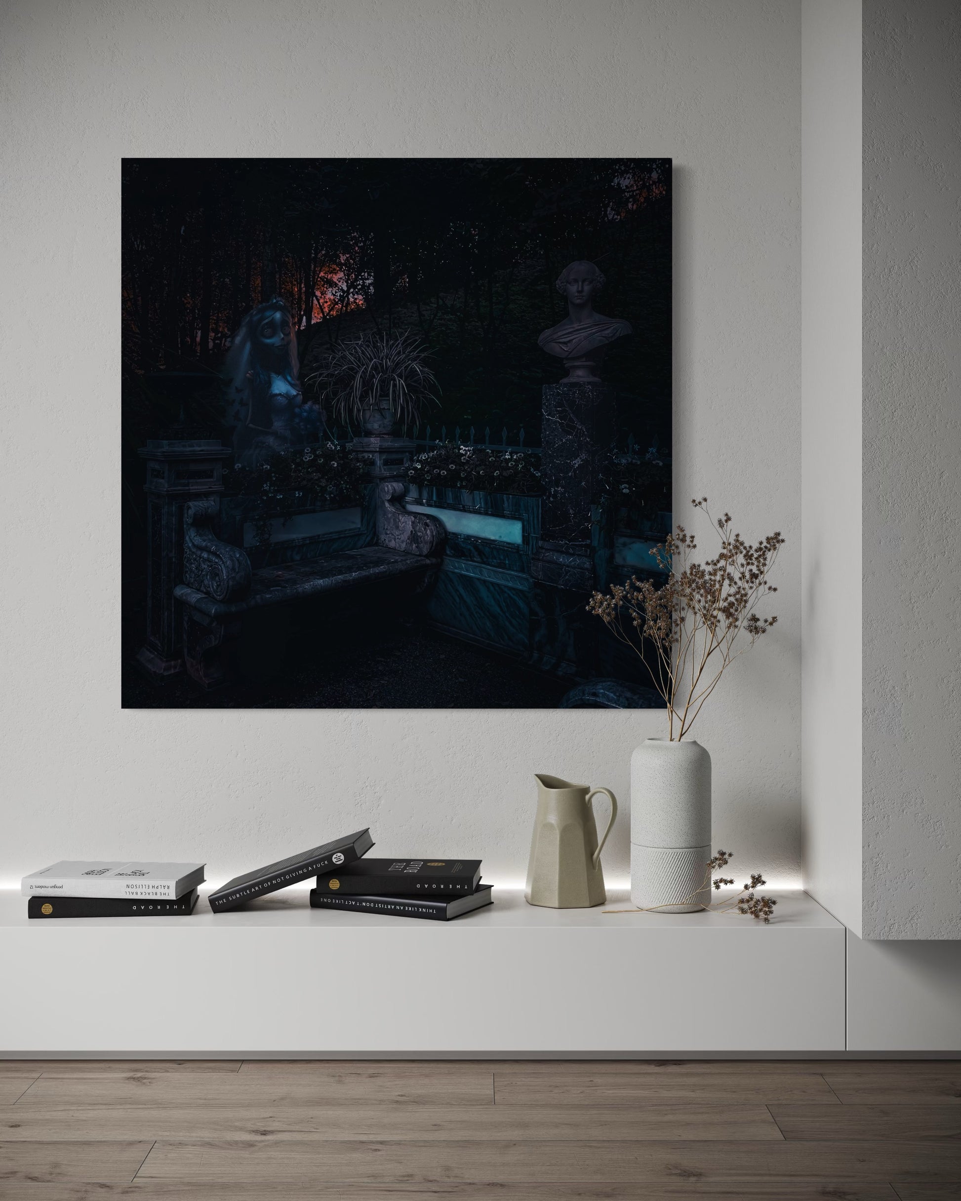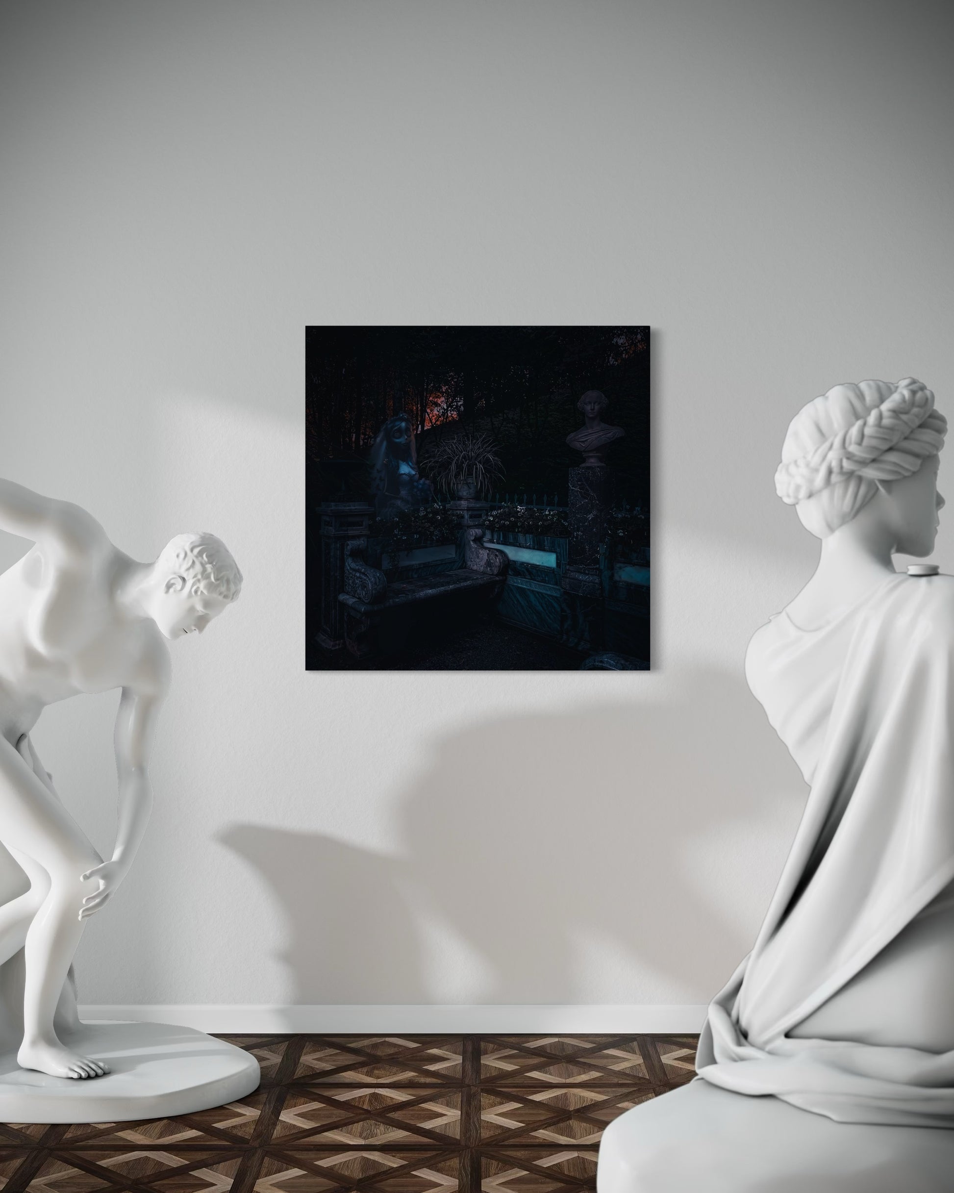A twilight garden scene inspired by dark fantasy and romantic melancholy. Perfect for lovers of gothic decor and cinematic aesthetics. This fine art print captures the haunting beauty of a marble garden at dusk, with ghostly light and gothic atmosphere inspired by dark fantasy films. Perfect for modern interiors, collectors, and art lovers who appreciate mysterious elegance.
