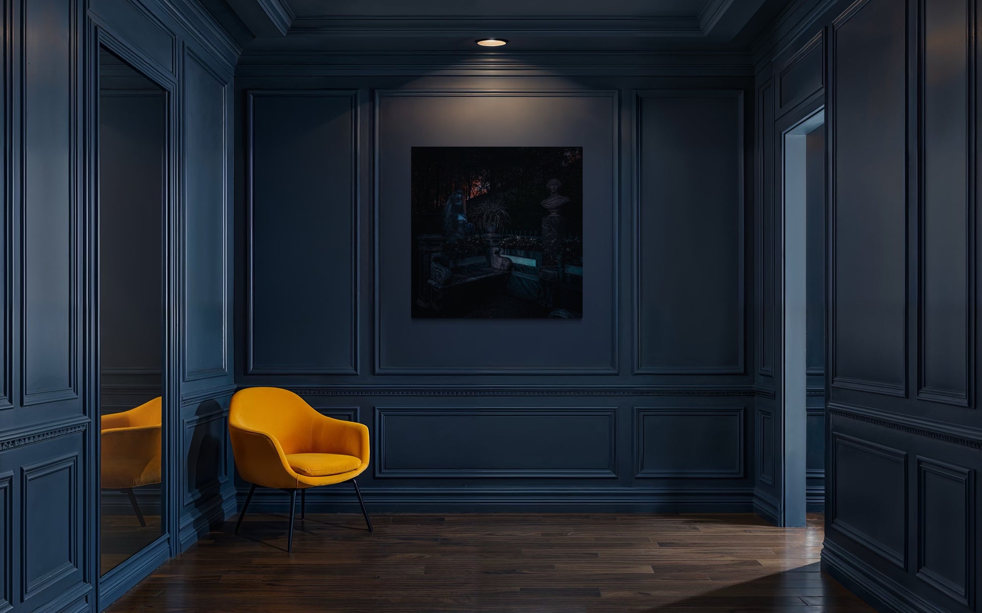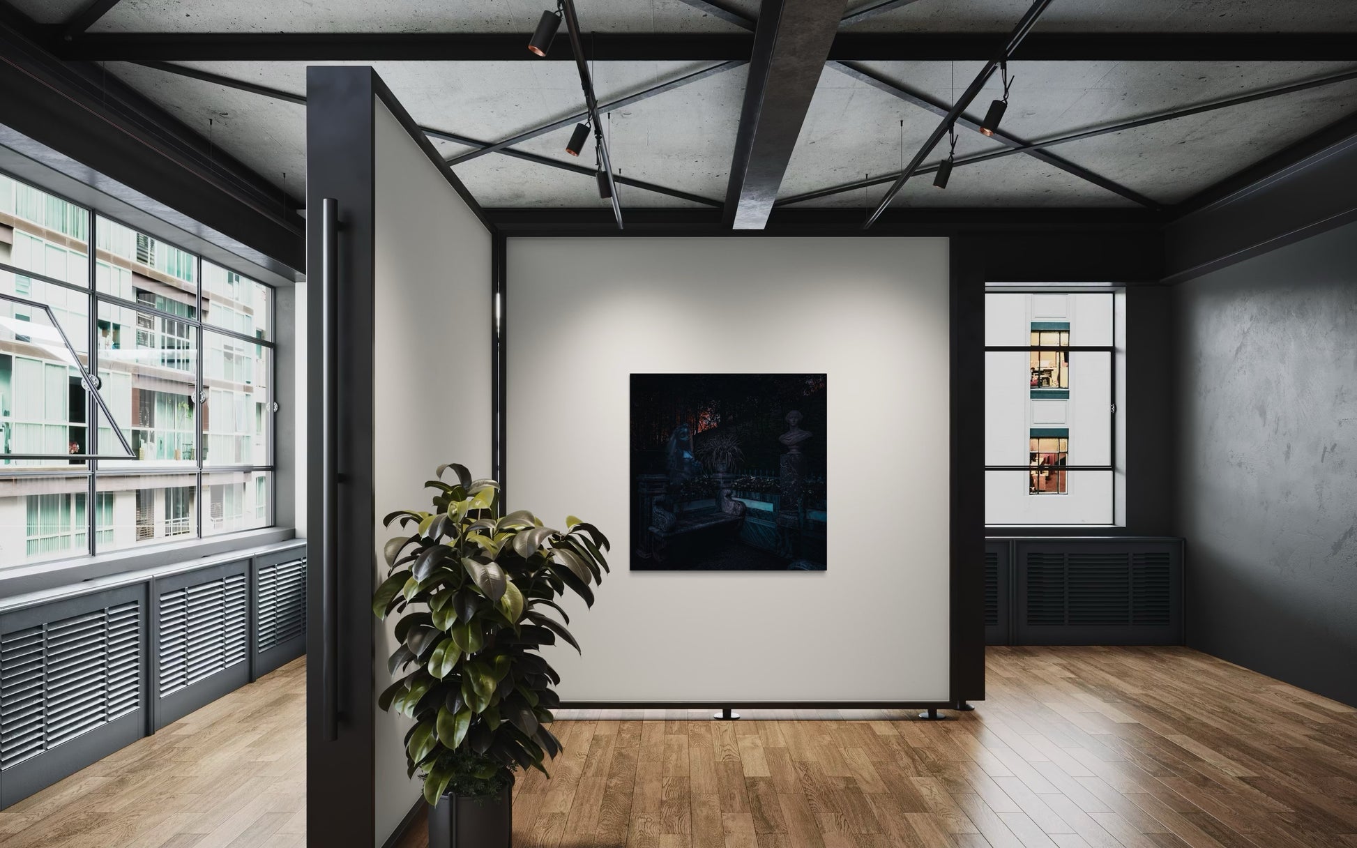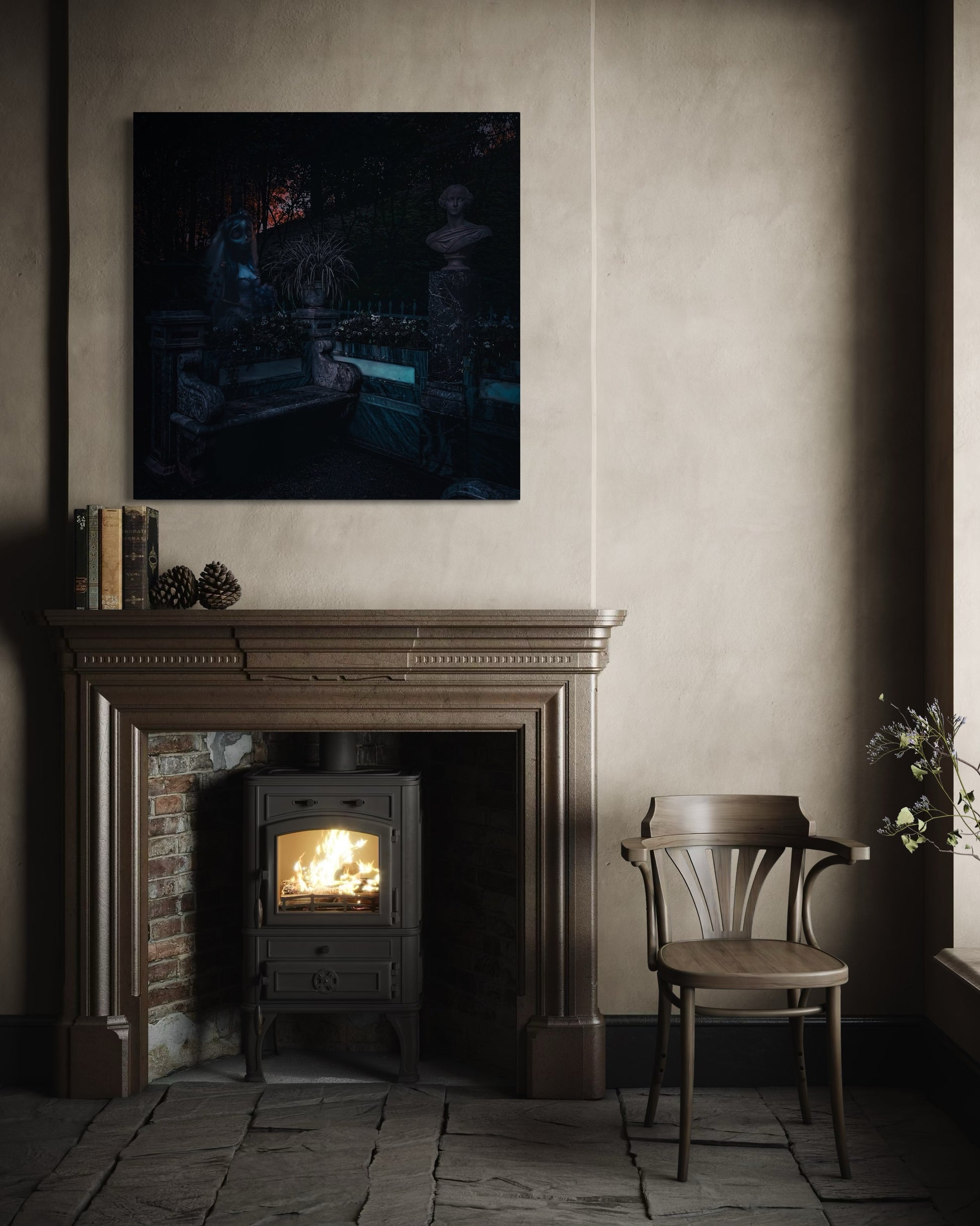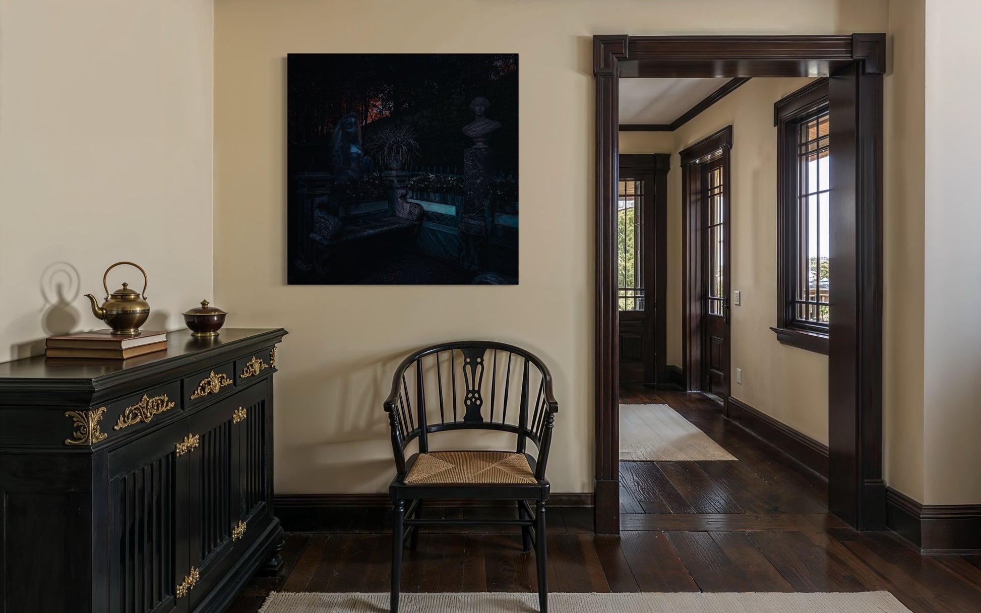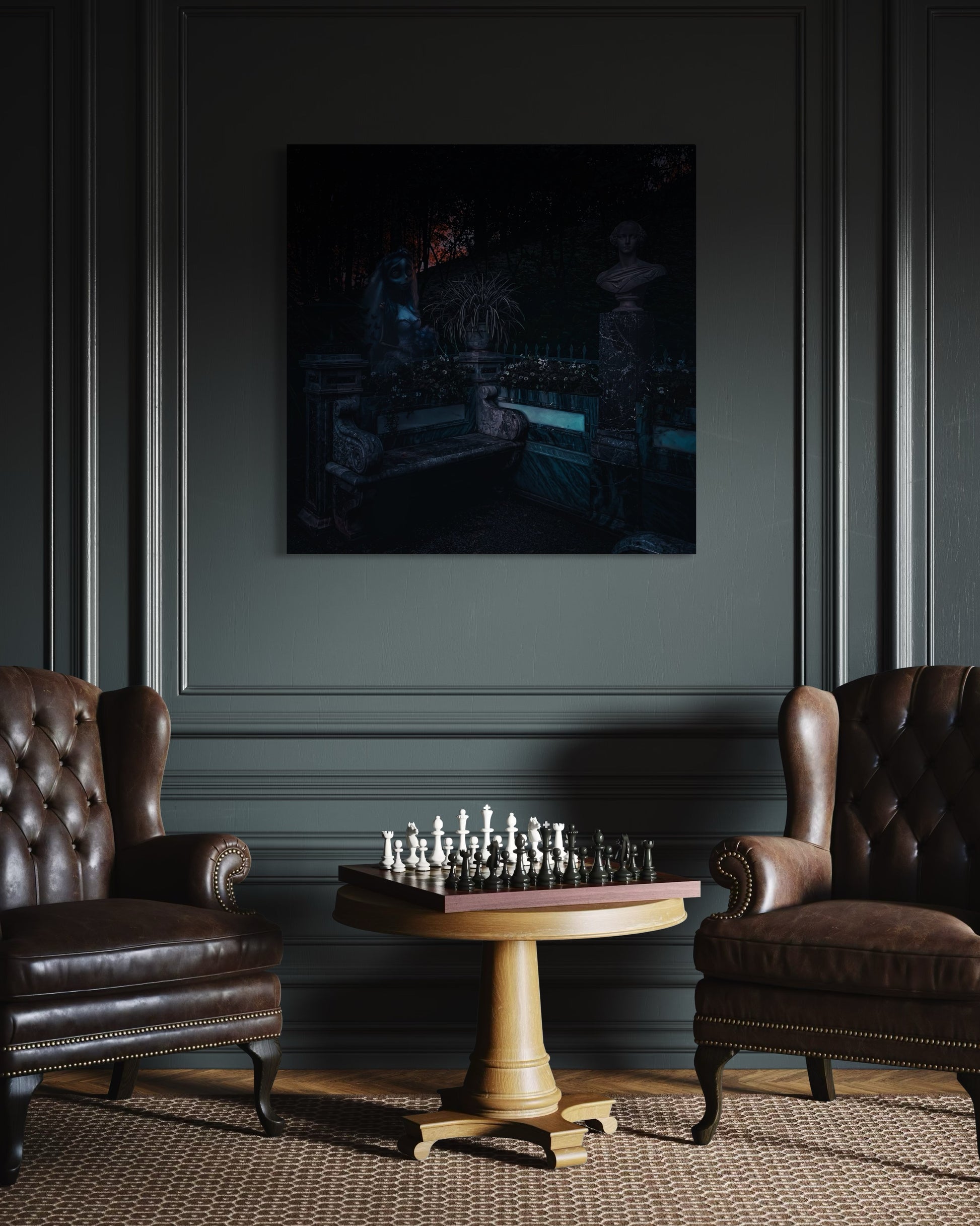 A twilight garden scene inspired by dark fantasy and romantic melancholy. Perfect for lovers of gothic decor and cinematic aesthetics. This fine art print captures the haunting beauty of a marble garden at dusk, with ghostly light and gothic atmosphere inspired by dark fantasy films. Perfect for modern interiors, collectors, and art lovers who appreciate mysterious elegance.