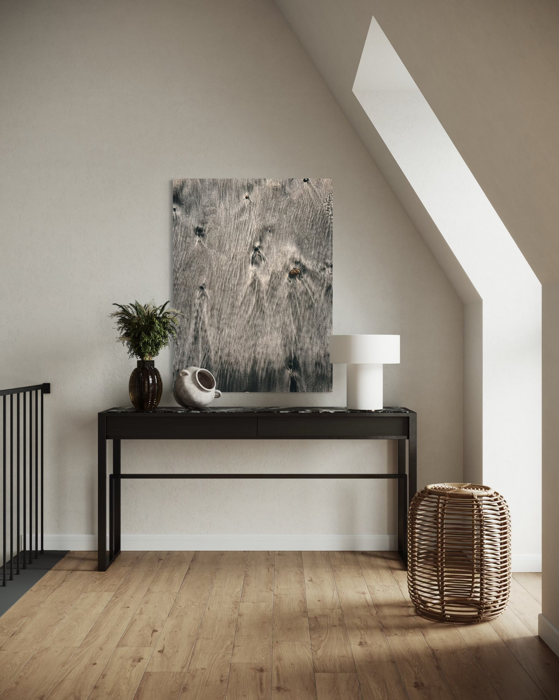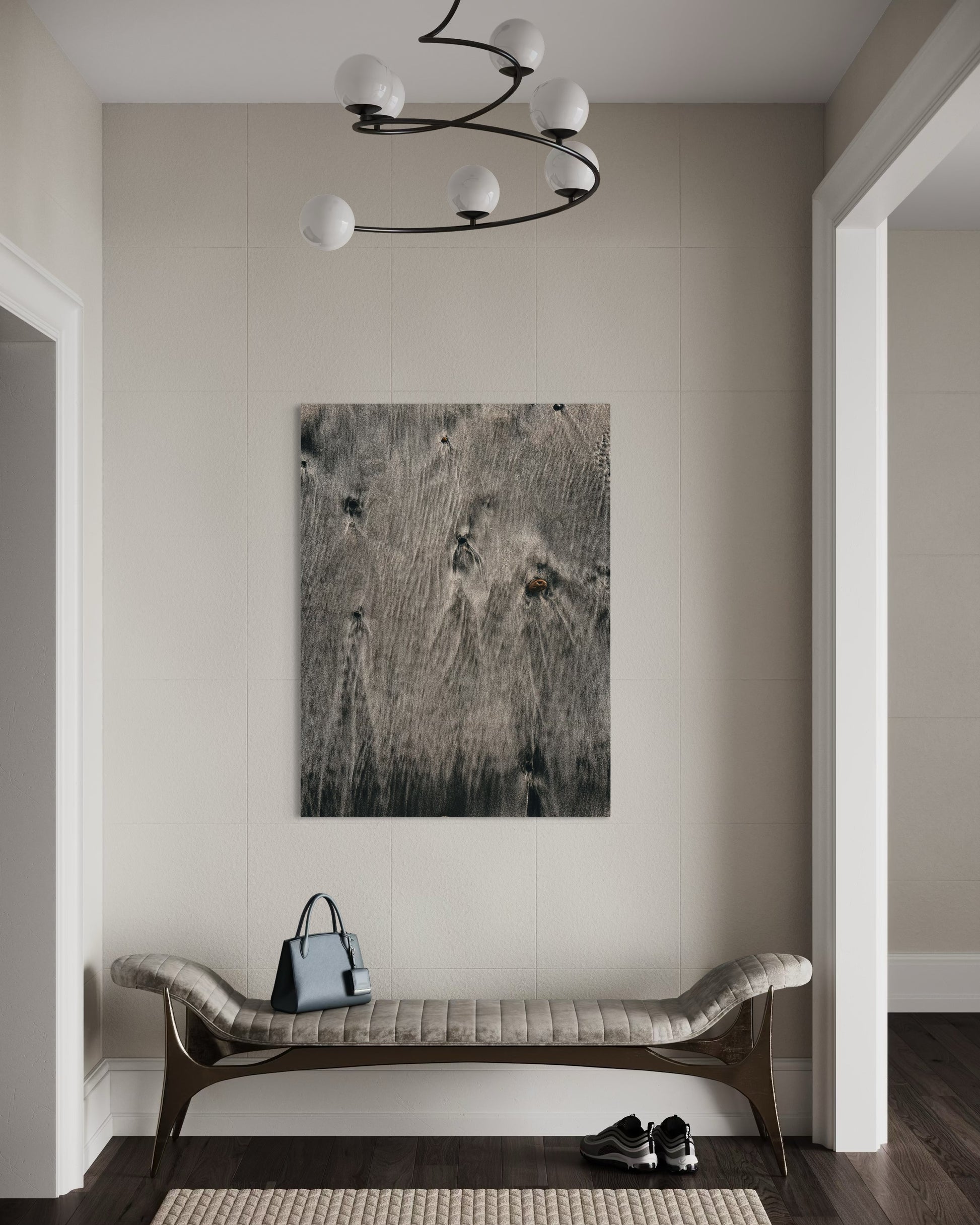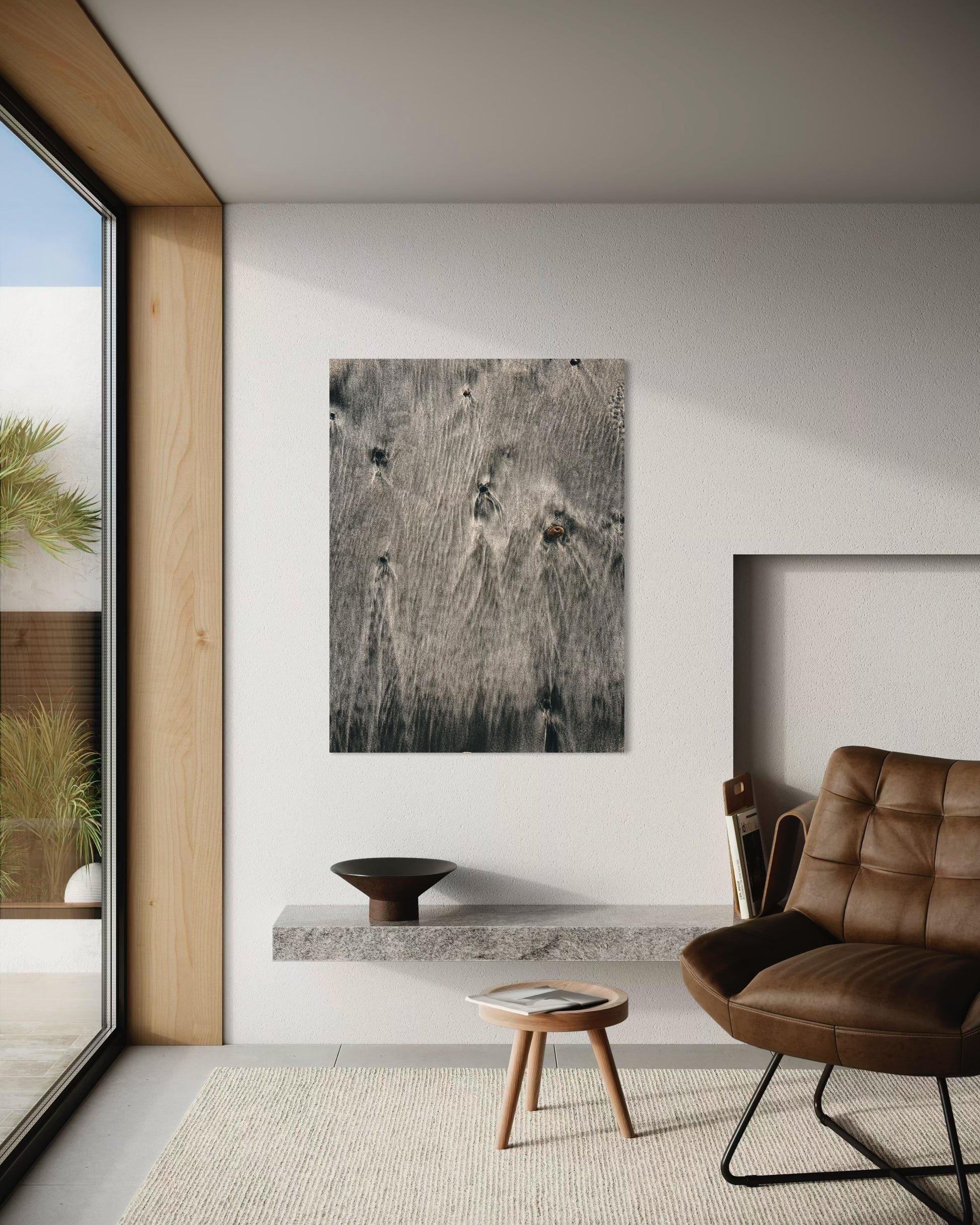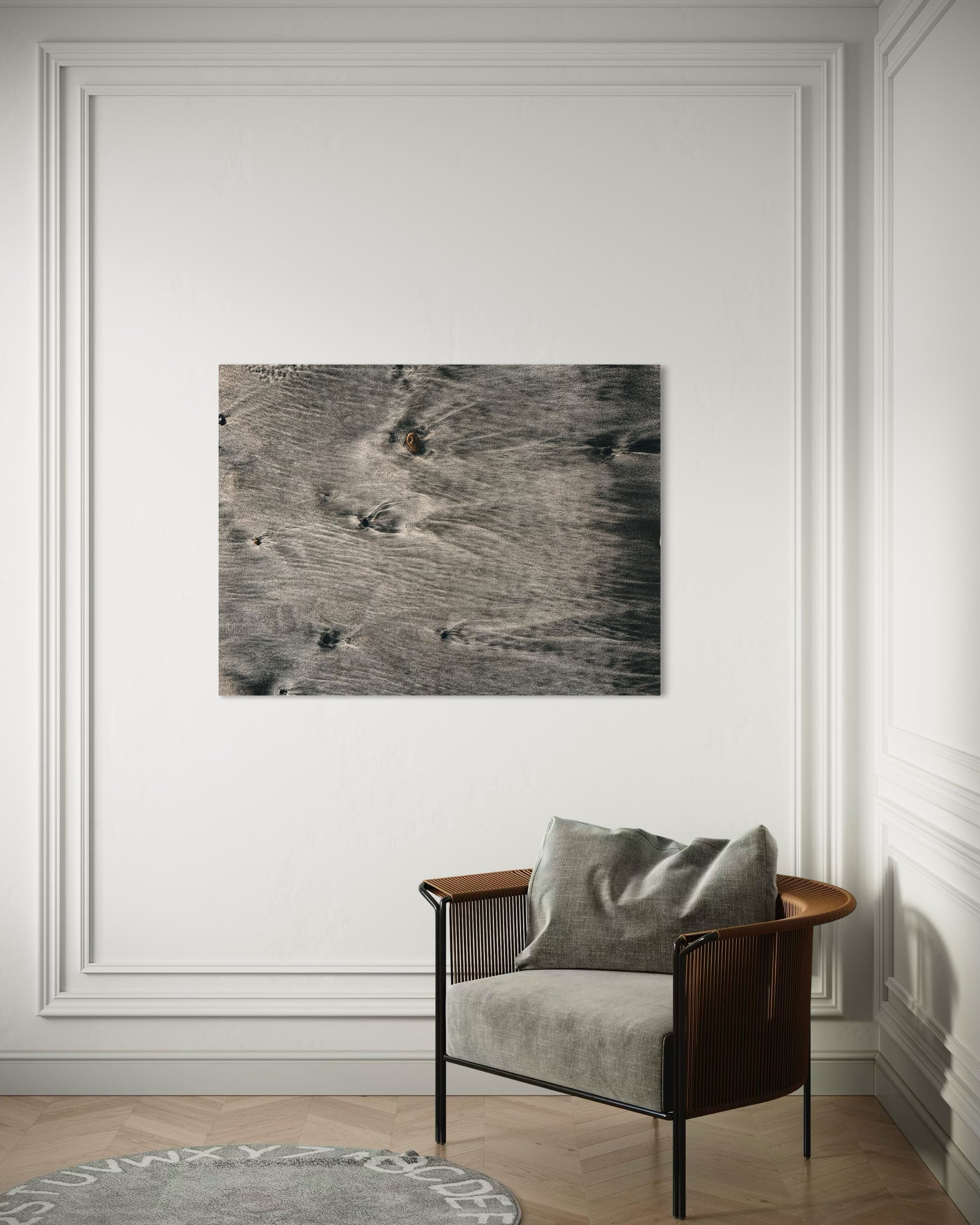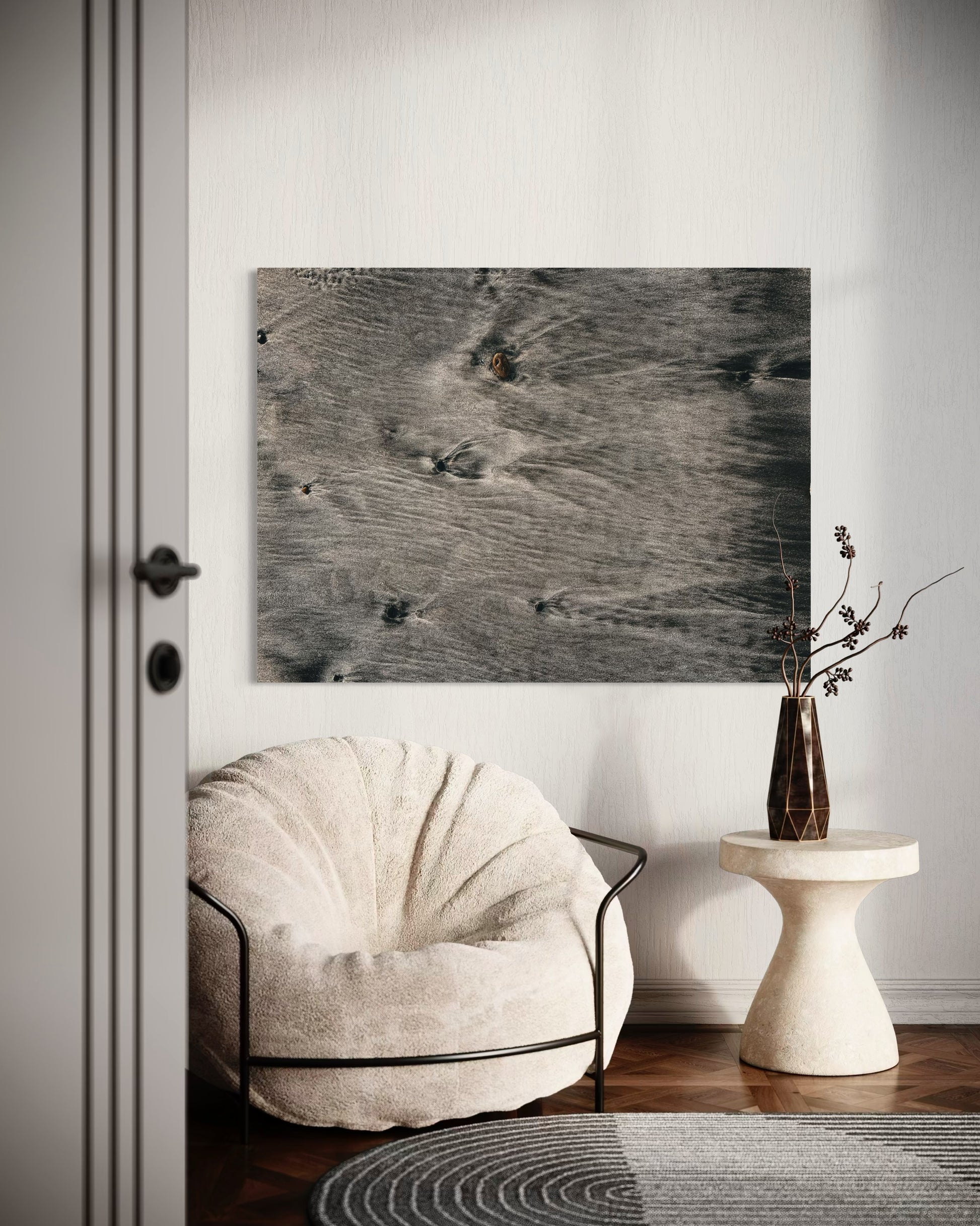The natural flow of wet sand and subtle ripples create a soothing, organic pattern that evokes the peaceful rhythm of the ocean. Perfect for coastal, neutral, or Scandinavian interiors, this artwork adds a touch of modern nature elegance to any space.