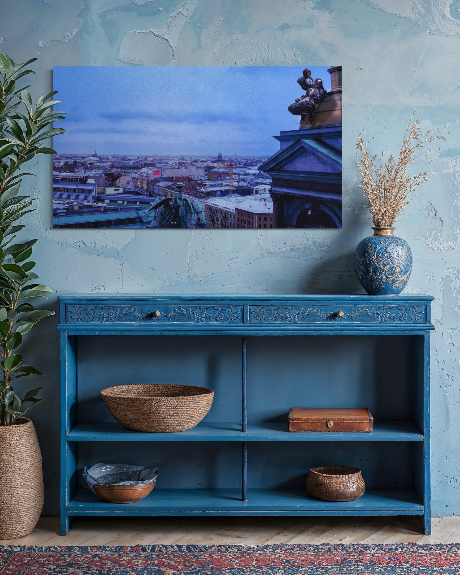 A stunning surreal cityscape of St. Petersburg under a deep blue evening sky, featuring an unexpected twist — Venom perched atop a cathedral dome, overlooking the winter rooftops below. This imaginative artwork blends classic European architecture with modern fantasy, creating a dramatic and humorous contrast. Perfect for fans of urban photography, pop culture mashups, and cinematic fantasy art.