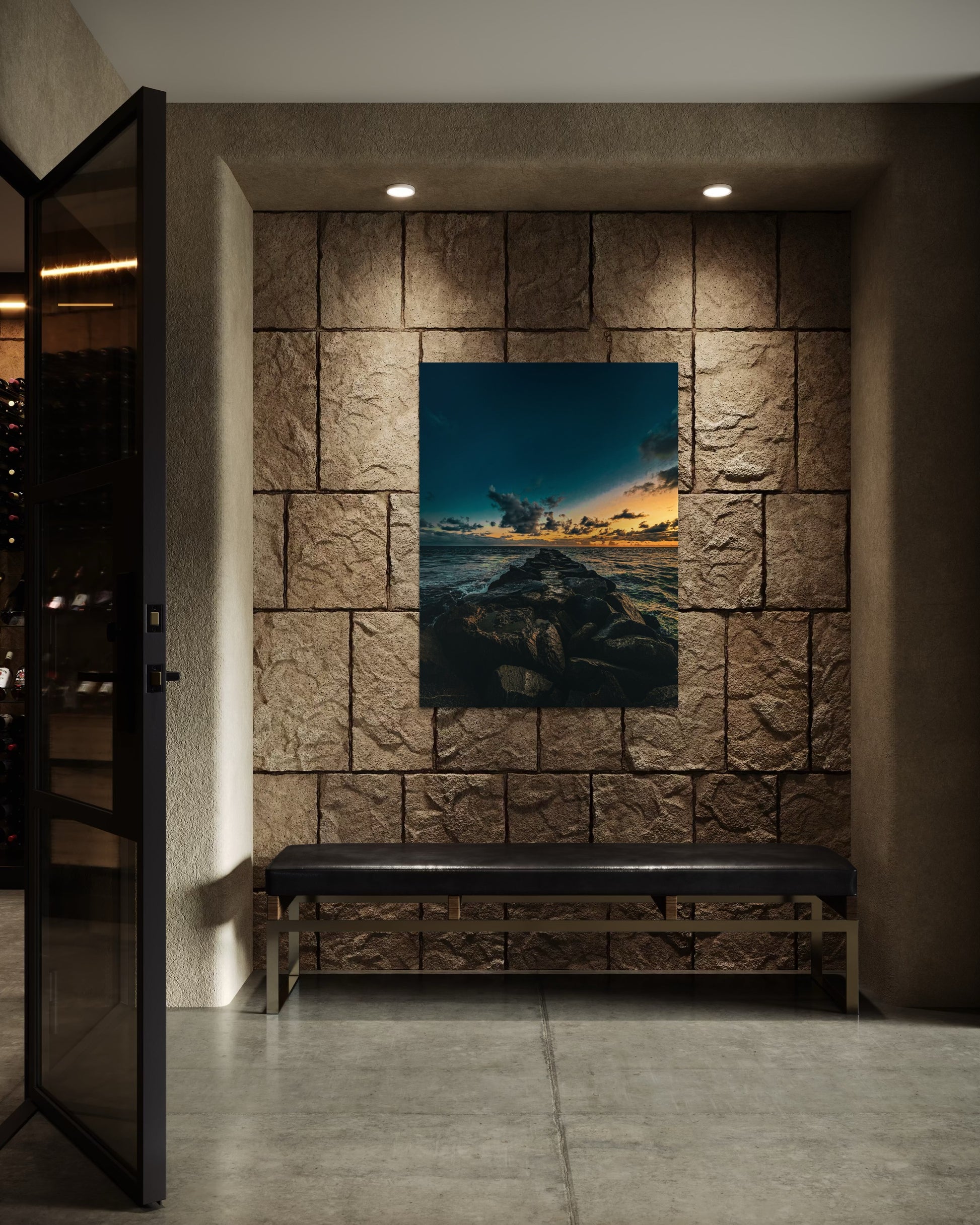 Premium Semi-Glossy Paper Poster Bring the power and calm of the ocean into your space.This fine art photograph by PolaDova captures a dramatic view of a rocky pier reaching into the sea beneath a glowing sunset sky. Deep blues, golden tones, and the motion of waves create a striking balance of serenity and strength.• Premium quality print — sharp details and vibrant colors•