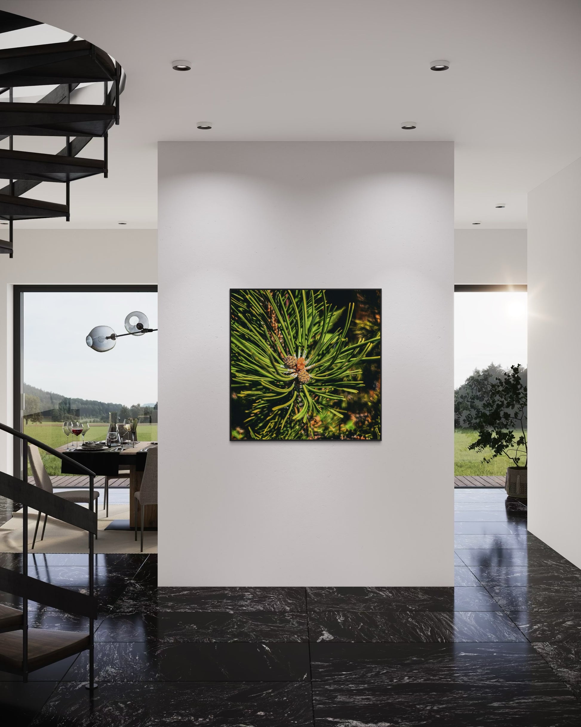 This fine art macro photograph by PolaDova captures the intricate beauty of pine needles, small cones, and glowing amber resin illuminated by sunlight.