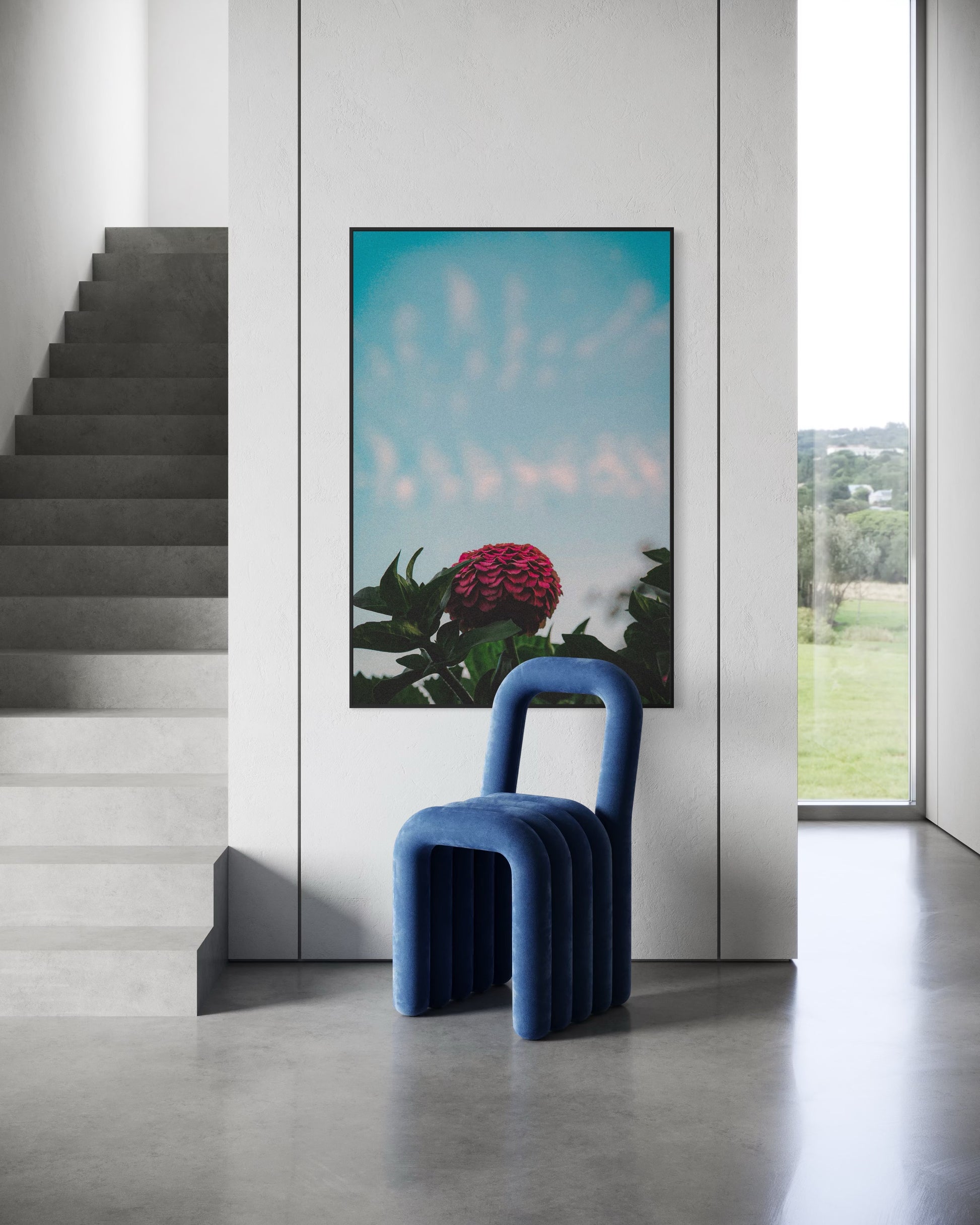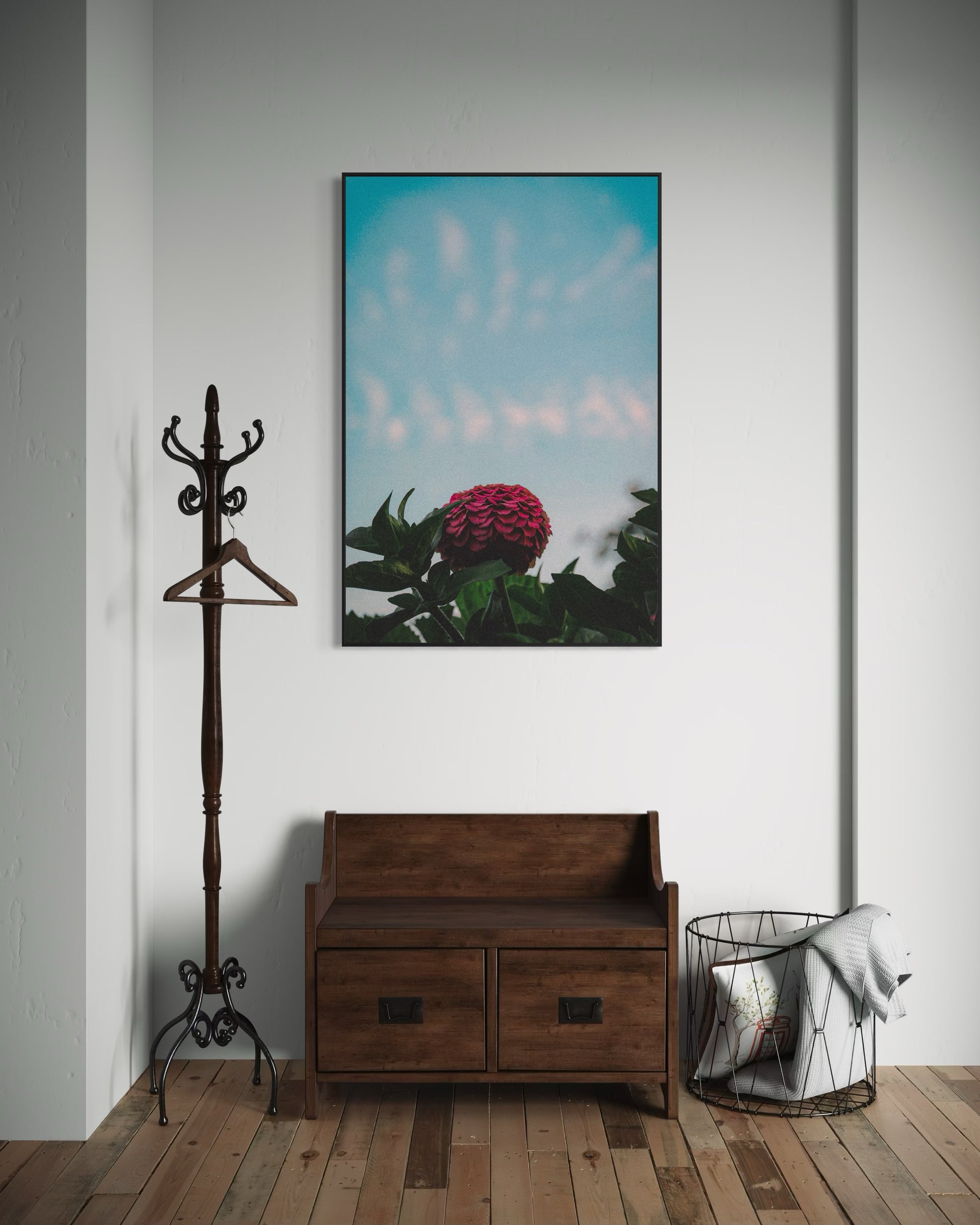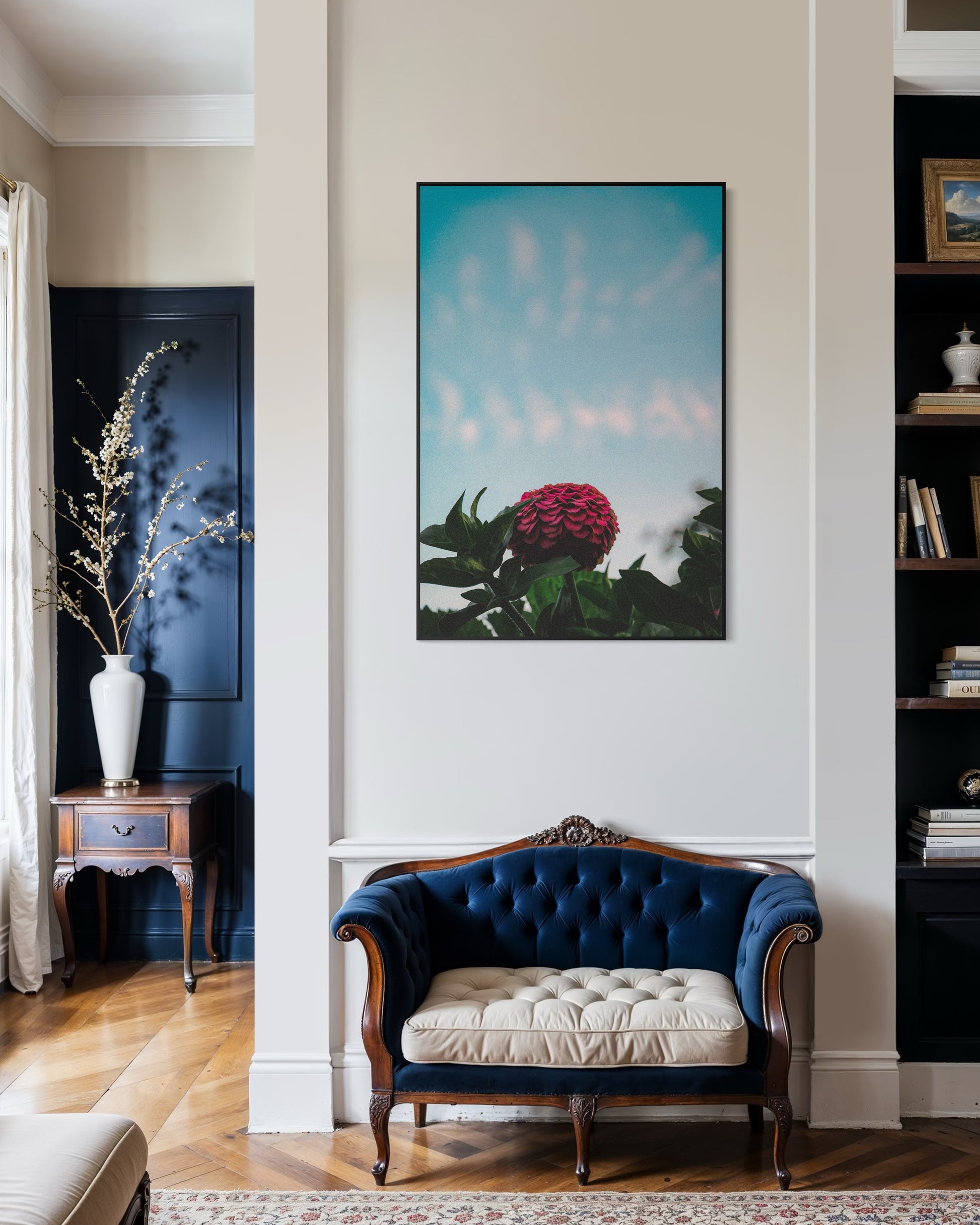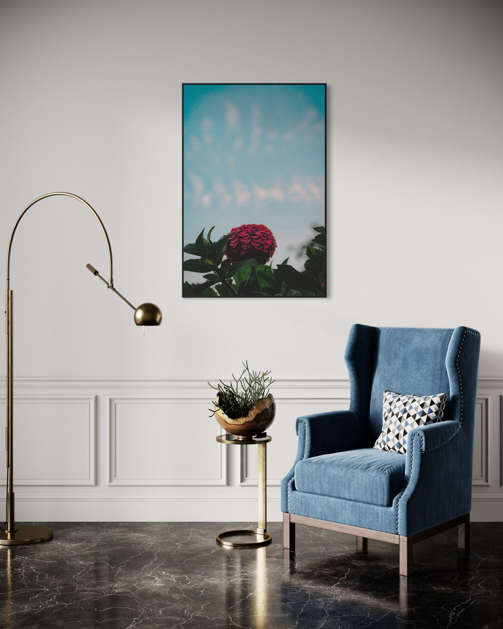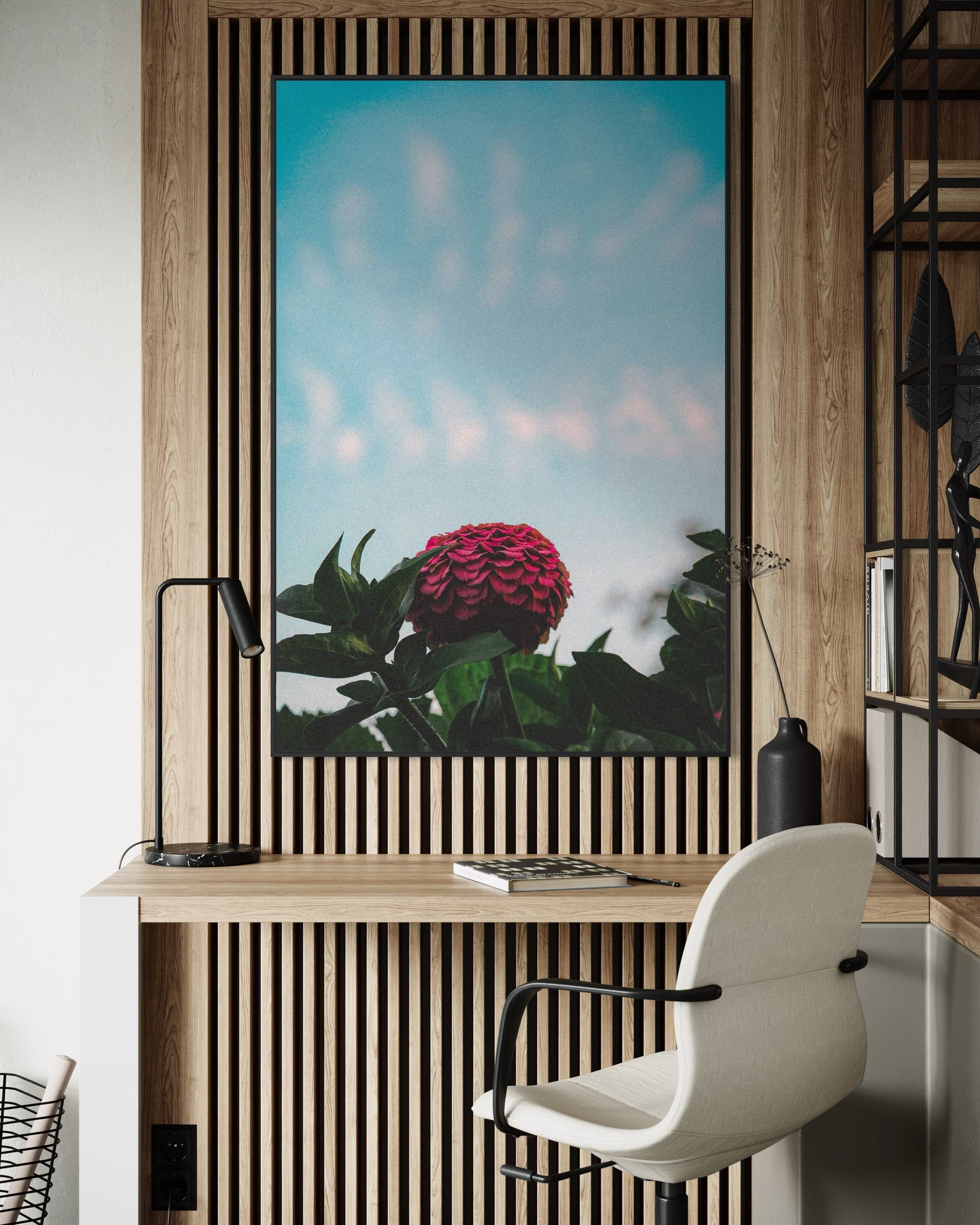 Bring calm and natural beauty into your home with this fine art photograph of a single pink zinnia reaching toward the soft turquoise sky.